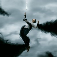 a person in mid-air with their arms raised and hands gripping what appears to be a wand or staff. They are surrounded by dark,