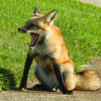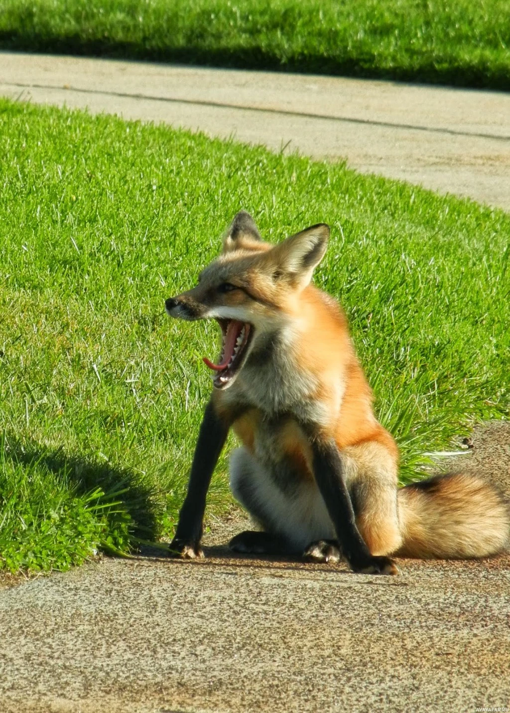 The image shows a fox sitting on grass near the edge of what appears to be