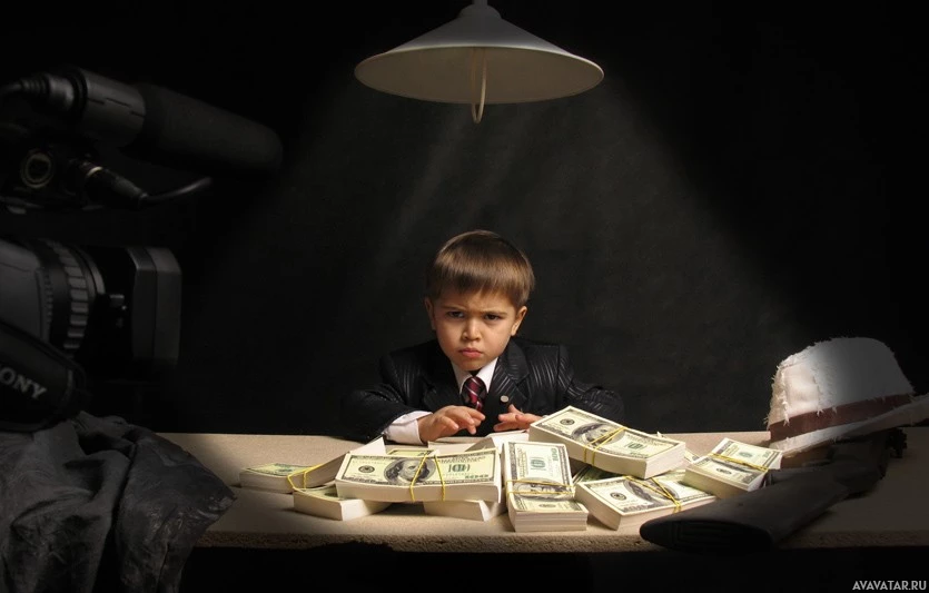 a young boy sitting at a table, surrounded by stacks of money. He appears to be crying or showing sadness. There is also