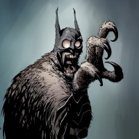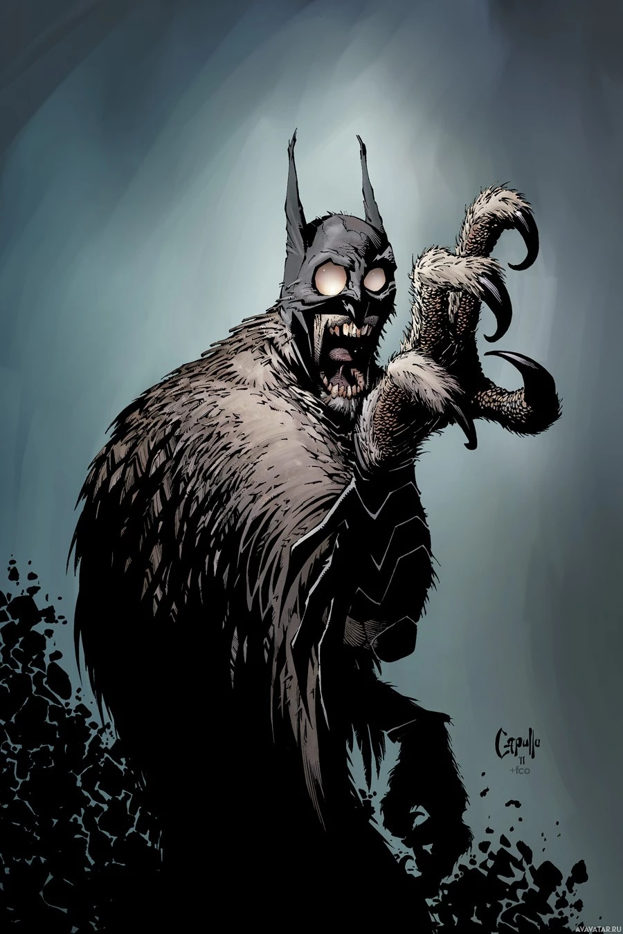The image features an artistic depiction of a character that appears to be Batman, transformed into a creature resembling a werewolf or some other