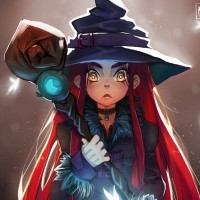 an illustrated character who appears to be a witch, as indicated by the fantasy elements such as the witch's hat and the wand. She has