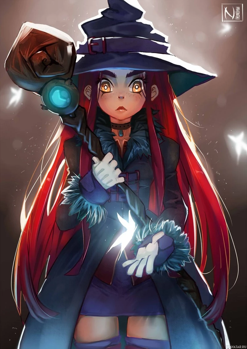 red hair and is holding a staff adorned with glowing crystals at the top, which might suggest magical properties. The character is dressed in a style that suggests she could be from