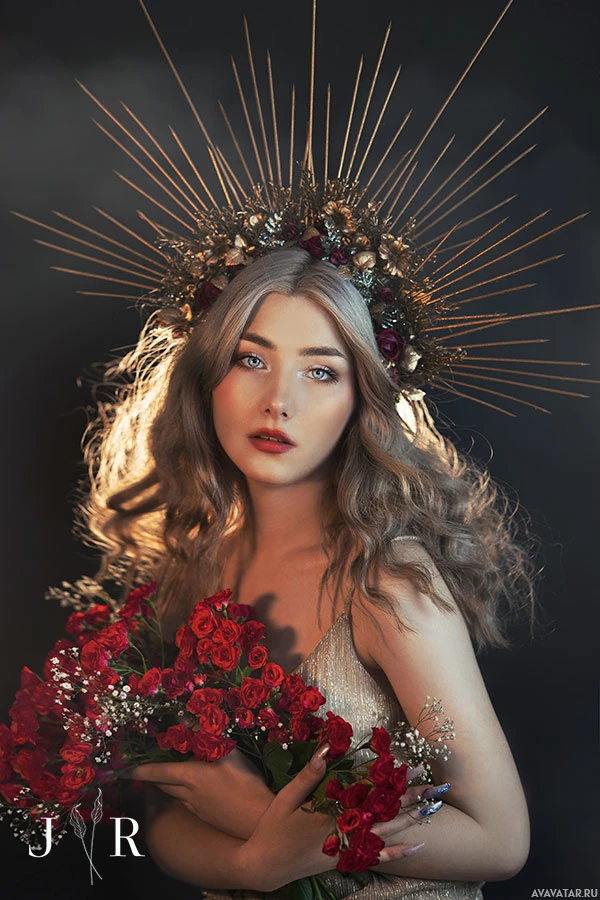The image features a person holding roses in their hands and wearing a decorative crown-like headpiece adorned with what appears to be metal or golden elements. The lighting is such that it casts a halo-like effect around the head of the individual, giving them an ethereal appearance. The background is softly blurred but gives off a warm and