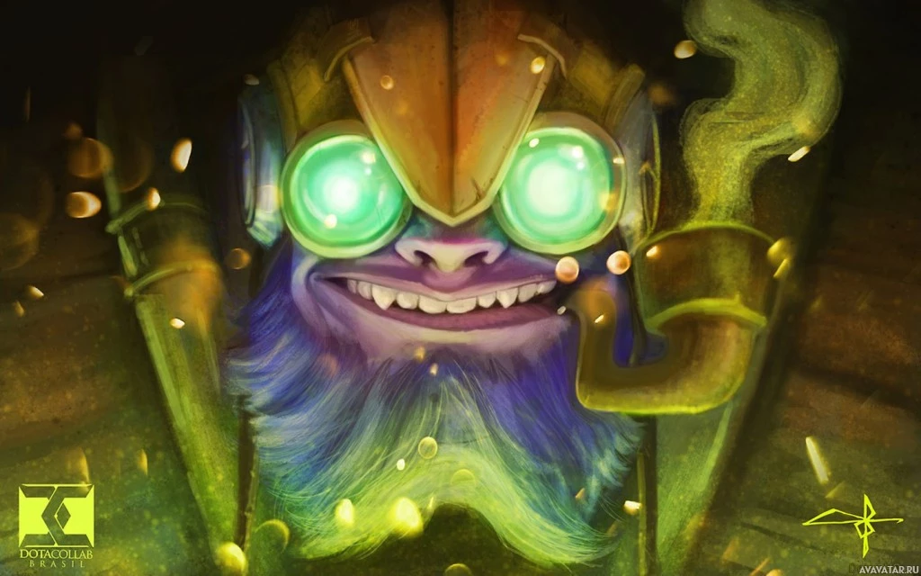The image features a character from the game Dota 2, known as Tinker. He is depicted with a beard and mustache, wearing an armor-like outfit with a helmet that has visors covering his eyes, giving him a somewhat mysterious appearance. The background suggests a setting that could be underground or in a dungeon, adding to the fantasy theme of the image. The artwork conveys a sense of character personality and the fantastical elements typical in