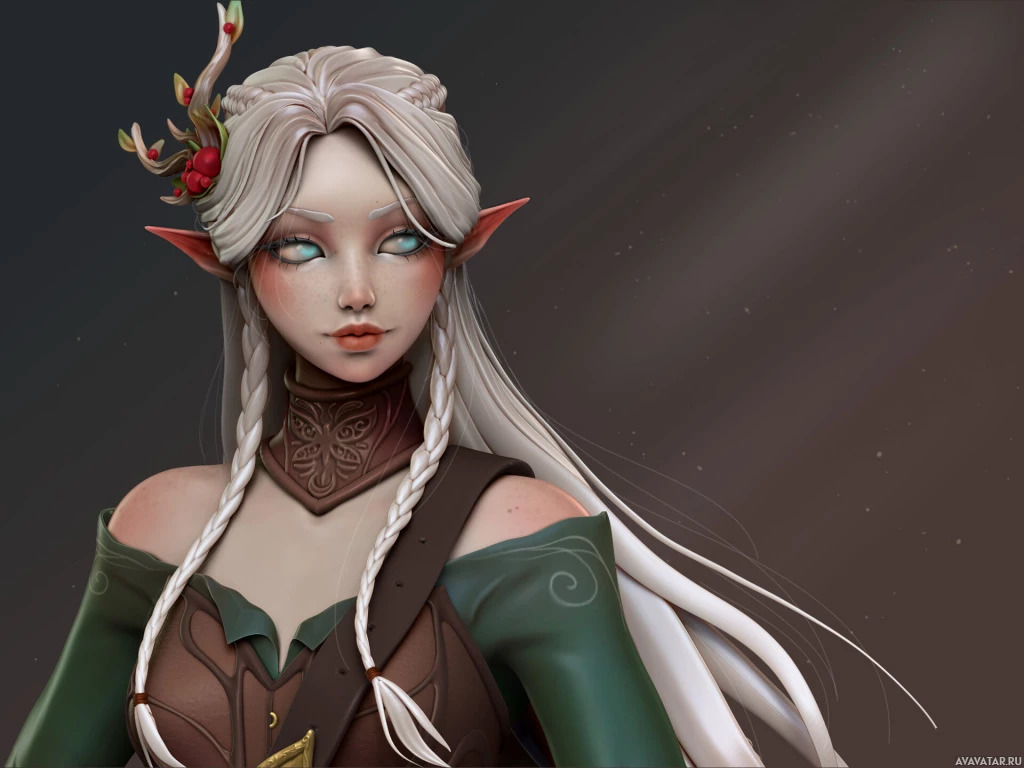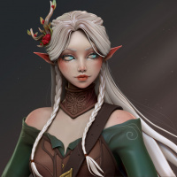 magical ability or connection to nature, as indicated by the small plant-like object on her shoulder. The background is minimalistic, allowing the focus to remain on the elf. This image would likely appeal to fans of