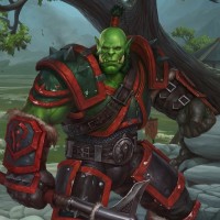 orc warrior. He is wearing armor with red and black colors, holding a weapon that appears to be an axe. In the background, there's
