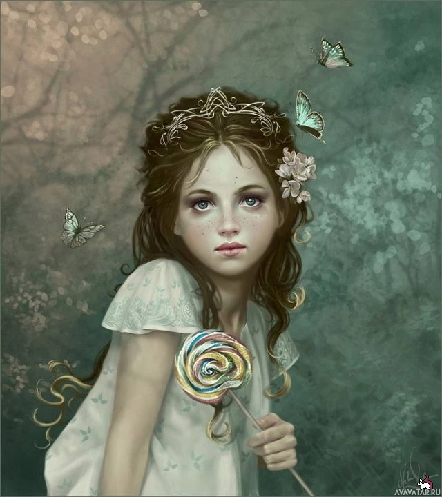 a candy stick that resembles a lollipop. The background suggests a dreamy or otherworldly setting with