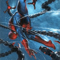 the air with webs attached to his wrists. In this particular artwork, Spider-Man is shown in