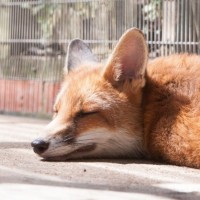 The image shows a fox resting on what appears to be a concrete surface, possibly within an enclosure. The fox is lying down with its eyes closed, seemingly asleep or at least in a relaxed state.