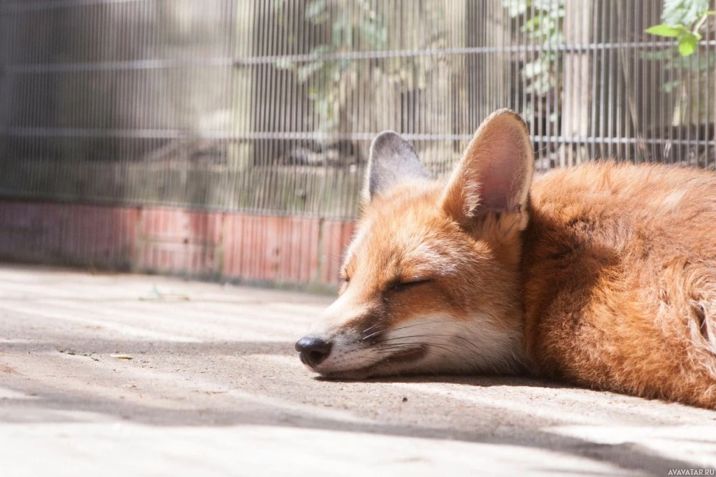 Картинка показывает лису, опирающуюся на то, что кажется бетонной поверхностью, возможно, внутри корпуса. Лиса лежит с закрытыми глазами, казалось бы, спящая или хотя бы в расслабленном состоянии.