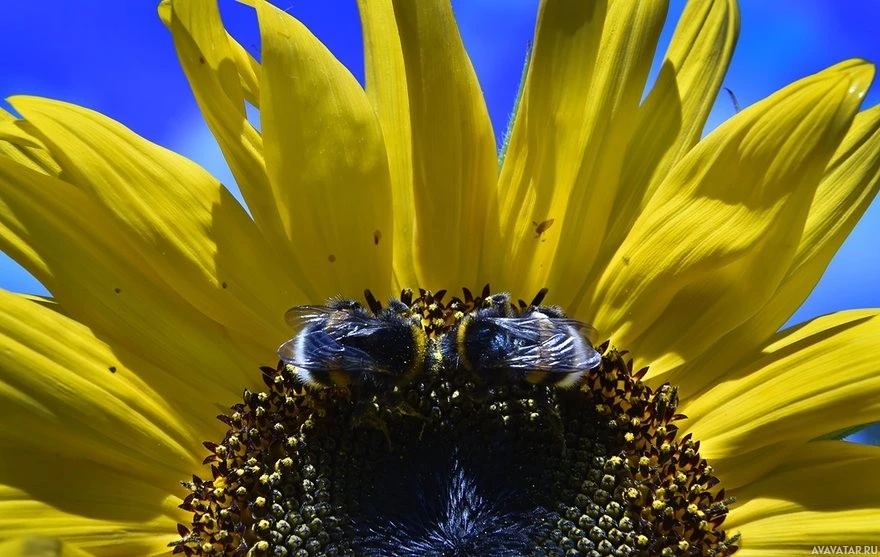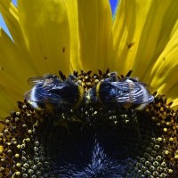 yellow petals and brown centers. In the middle of the flower, there is a group of bees, which appear to be bumblebees based on their size and coloration. The background is mostly