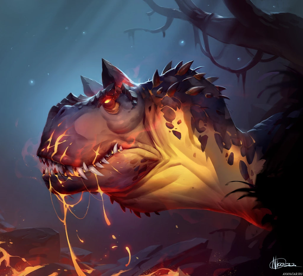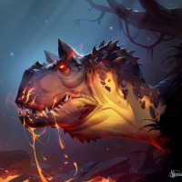 wide eyes and mouth agape. It appears to be roaring, as suggested by the flame-like structures emanating from its mouth and throat area, which contribute to the dramatic and intense atmosphere of the image. The background is shrouded in darkness, with twisted branches and what seems to be a molten surface or fire underfoot, adding to the otherworldly and chaotic