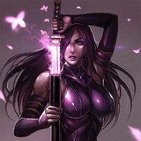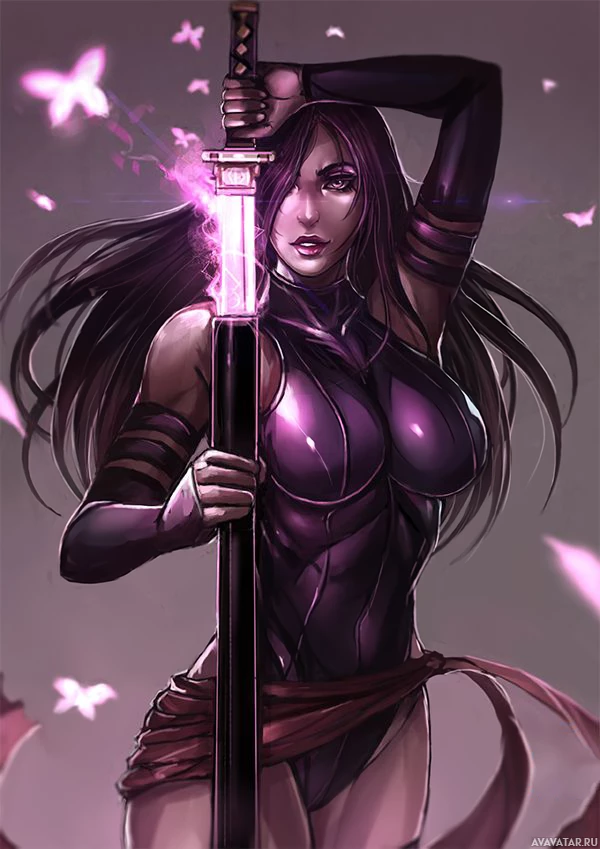 a female character with long purple hair, holding a sword. She appears to be in motion or ready for combat. The character is wearing tight-fitting clothing that suggests she might be