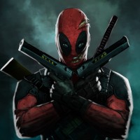 The image features a character known as Deadpool. He is depicted holding two guns crossed in front of him, with one hand on each gun. His attire includes a red and black suit that gives the impression of
