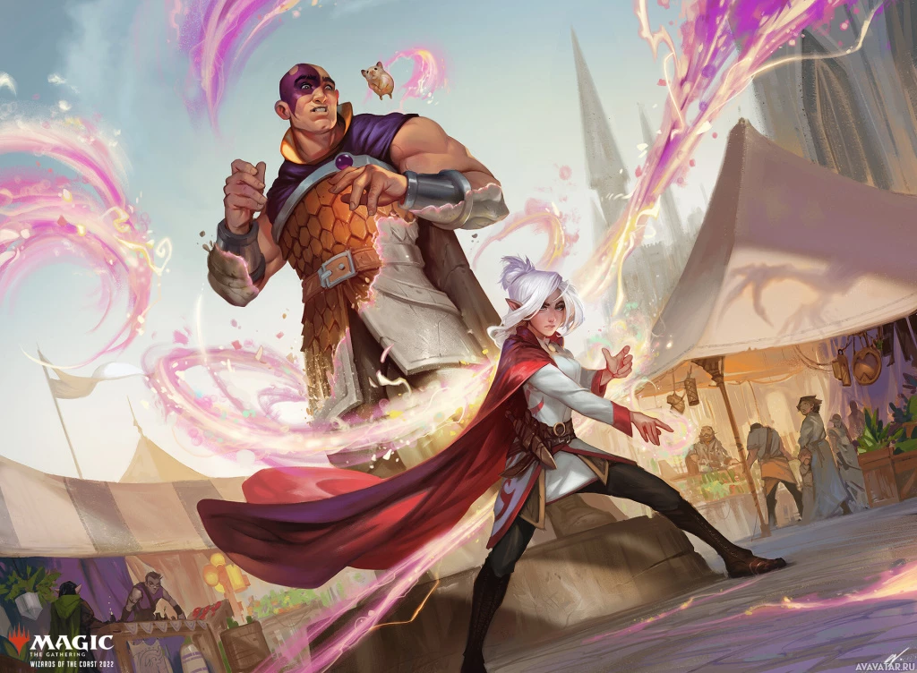 character on the right is wearing a cloak and has her fist raised as if she is casting a spell or preparing for combat. The background features a whimsical village setting with tents and a castle-like structure in the distance, which adds to
