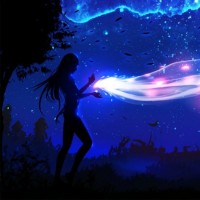 long hair, seemingly interacting with the night sky. The individual appears to be casting something upwards that resembles stars or magical energy against the backdrop of an aurora-filled