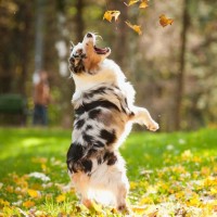 hind legs and seemingly trying to catch a leaf that is airborne. There are no visible people in the picture, and the environment appears to be a park or an area with grass and