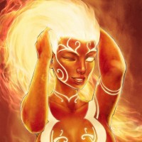 This image features a fantasy-themed character who appears to be on fire, with flames engulfing her body. She has tattoos or markings on her skin that could be interpreted as tribal or fantasy elements. The background is dark with
