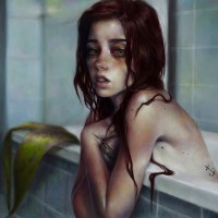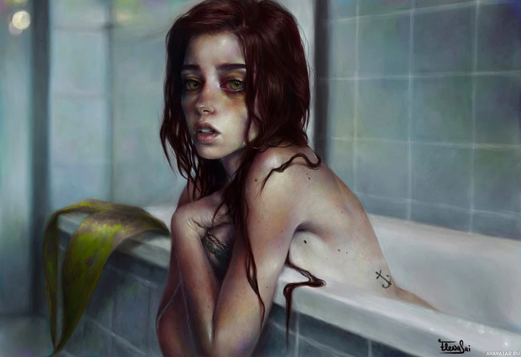 fish scales on her torso, a tail, and gills visible on her neck. She appears to be in distress or pain, as indicated by the blood around her wrists, the scratches on her body, and