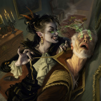 dim lighting, and there are various objects scattered around that add to the ambiance of a historical or mythical narrative, such as candles and what appears to be a painting hanging on the wall in the background. The character on the left is also holding out her hand towards the man, which could suggest she's attempting to control him with magic or some other supernatural ability.