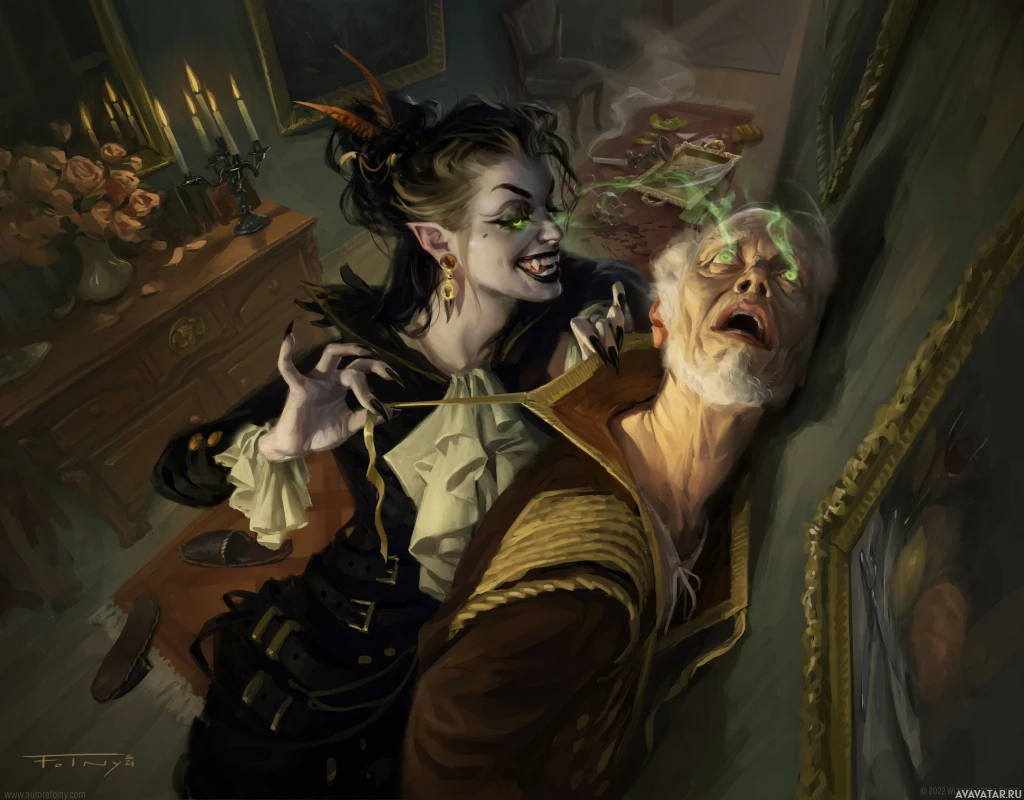The image depicts a fantasy-themed scene where two characters are engaged in what appears to be
