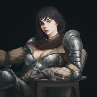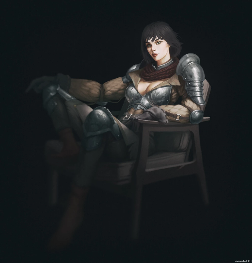 a female character sitting on a chair. She has brunette hair and is wearing a metal armor with a cape or scarf over her shoulders, suggesting she might be a warrior or adventurer in