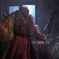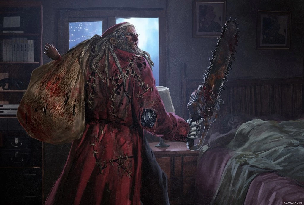 Santa Claus. However, instead of a jovial and festive appearance associated with Santa Claus, this character has a menacing and grizzled look, with visible wounds or scars. The setting appears to be an indoor room with a desk and books in the background, suggesting a darker or sinister atmosphere rather than a typical
