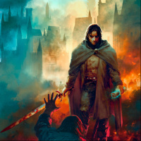 a heroic figure, possibly a wizard or a sorcerer due to the presence of magical energy surrounding his hand. The character is wearing what looks like armor with a cape and has a staff in his other hand. Surrounding this central figure are