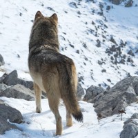 covered terrain with rocky outcrops. The wolf appears to be alert and is facing towards the right side of the image. There is also another