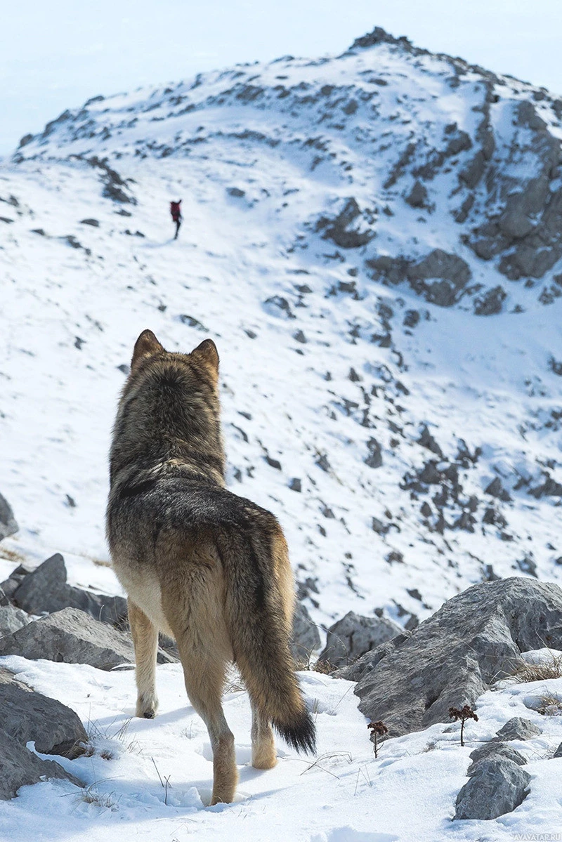 figure in the distance on the hill, but it's not clear what that person is doing from this perspective. The overall setting suggests a cold, possibly mountainous environment during winter or