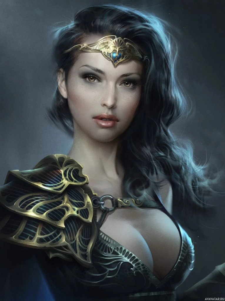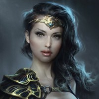 brunette hair, wearing an ornate armor and a headpiece that resembles a crown or helmet. The setting appears to be dark and moody, possibly suggesting a fantasy or epic theme. She has