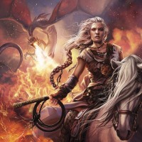 Daenerys Targaryen from the "A Song of Ice and Fire" series, which is adapted into the television show "Game of Thrones." She is riding a horse with a dragon on her shoulder, wielding a whip. The background shows fire and smoke, indicating some sort of battle or conflict scene.