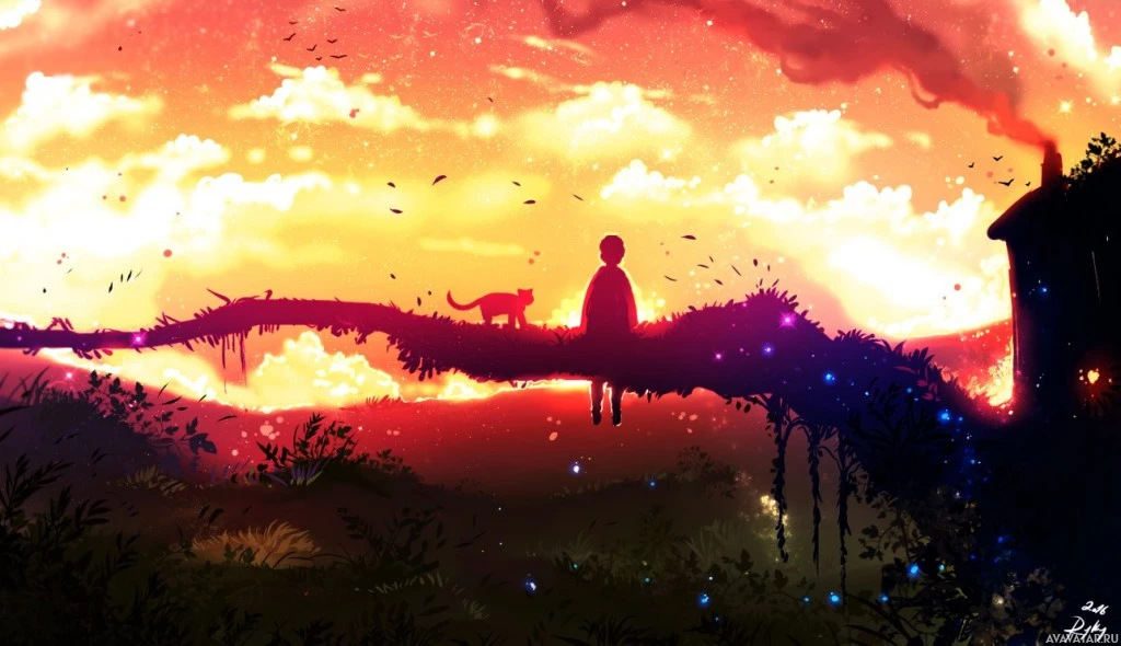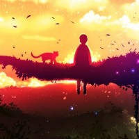 vibrant colors, ranging from orange and pink hues near the horizon to deep blues further up in the sky. In the foreground, there are elements that could be interpreted as a cat or a dog due to their silhouette-like appearance, but it's not entirely clear what these shapes represent. The setting seems to be a tranquil