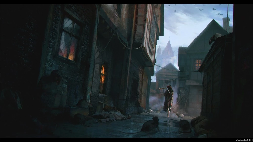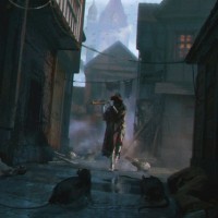 a narrow alleyway with buildings on either side, which could be indicative of the time period being portrayed. There are characters interacting within this environment, and the overall atmosphere suggests