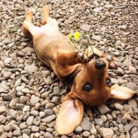 dachshund dog lying on its back with its belly exposed, seemingly relaxed and possibly enjoying the sun. The dog has one paw raised as if it's waving or trying to grasp something. There is also a single