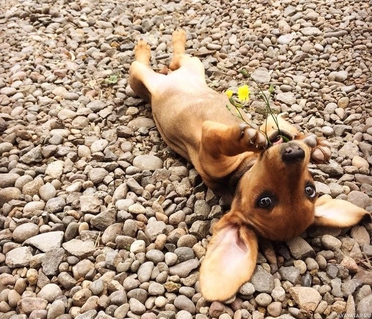 yellow flower near the dog's nose, which appears to be a daisy. The surface under the dog seems to be composed of small rocks, suggesting