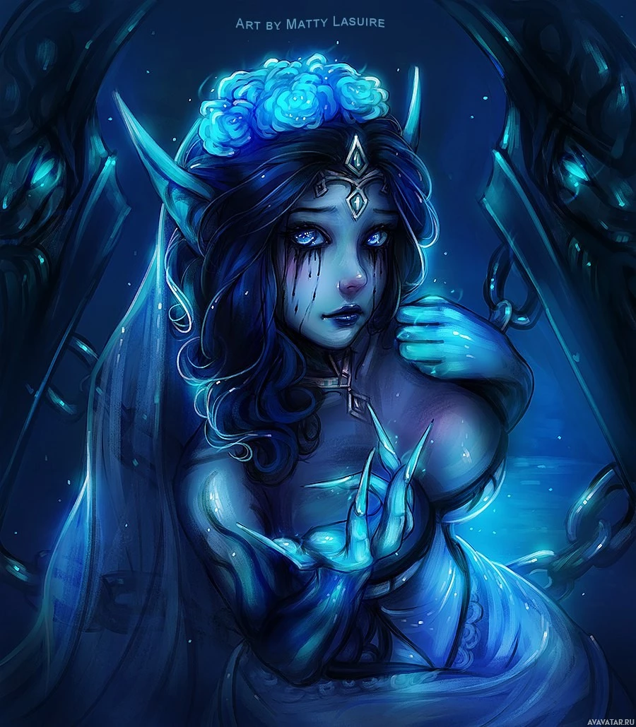 fantasy character who appears to be an elf with blue hair. She has a delicate and ethereal appearance, with light-colored skin and pointed ears that are typical of