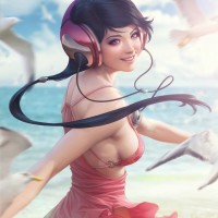 a cheerful expression, possibly dancing or enjoying herself outdoors at the beach, as indicated by the sandy ground and sea birds flying nearby. There are also some seashells visible on the ground, further enhancing the beach theme of the image.