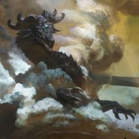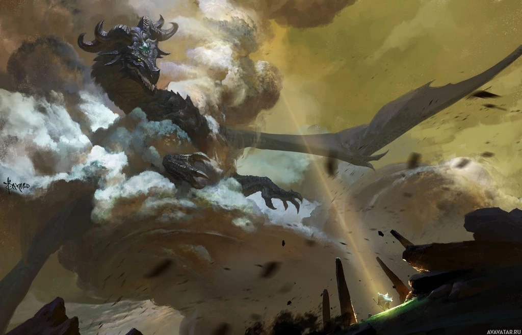 small figures that could be human warriors or mages confronting the dragon, adding a sense of scale to the scene. The overall atmosphere is one of