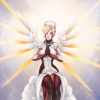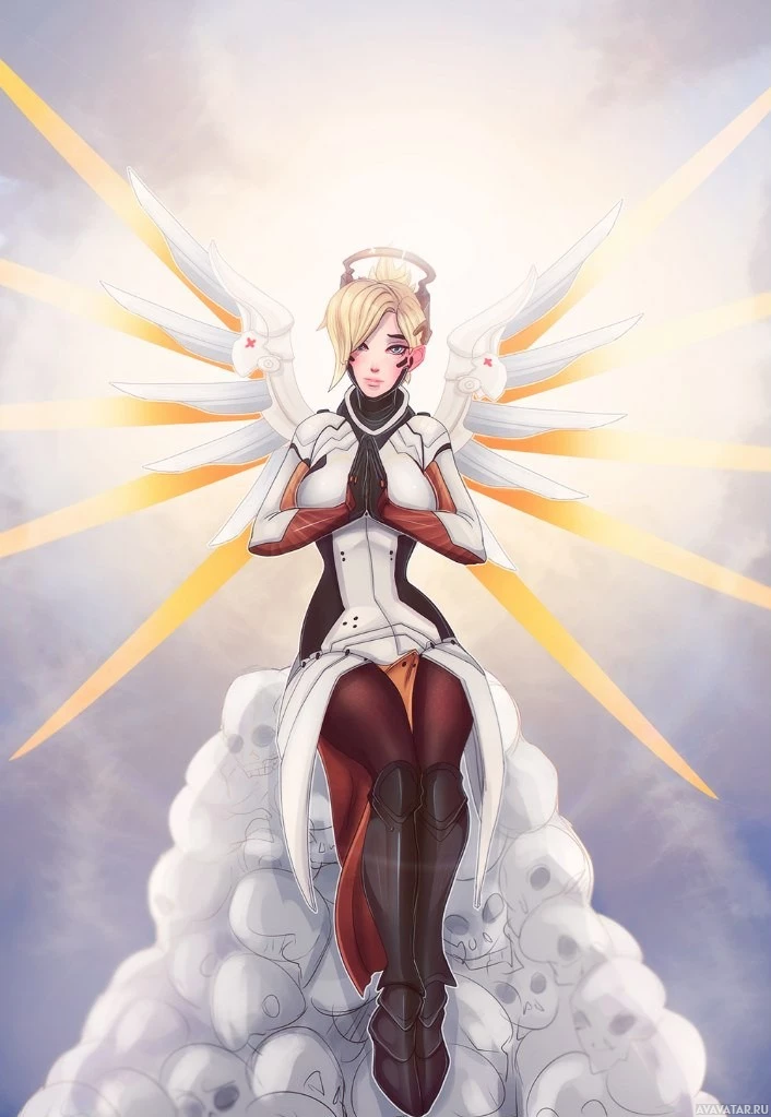 The image features a character from the video game Overwatch. This character is known as Mercy, and she is depicted in an angelic form, which is a reference to her abilities in the game where she heals allies with wings spread wide.