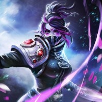 a dark environment. There are also hints of pink petals scattered around, which could suggest that this scene is taking place during spring or after some sort of magical event has occurred. The image is rich in detail and color, with the character's purple and white armor contrasting against the dark background, creating a visually striking image. The overall composition suggests action and fantasy elements typical of video game artwork for games like Dota 2.