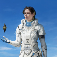 a female character dressed in futuristic astronaut gear. She has long