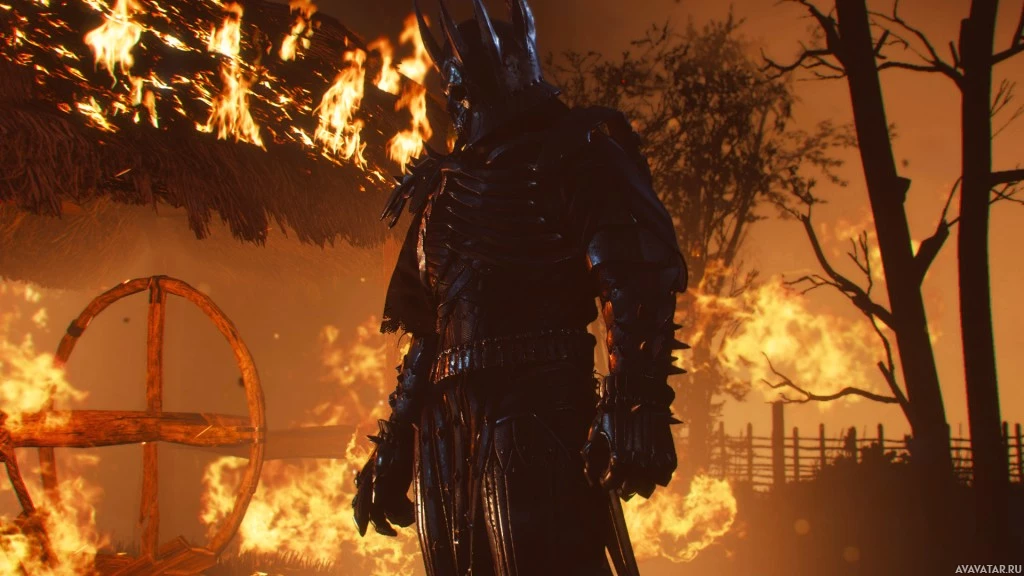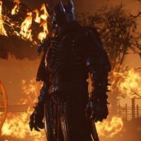 a fiery backdrop with what appears to be a burning wagon or carriage to the left side of the image. The atmosphere suggests chaos and destruction, which could be part of the game's narrative involving battles and