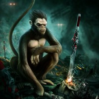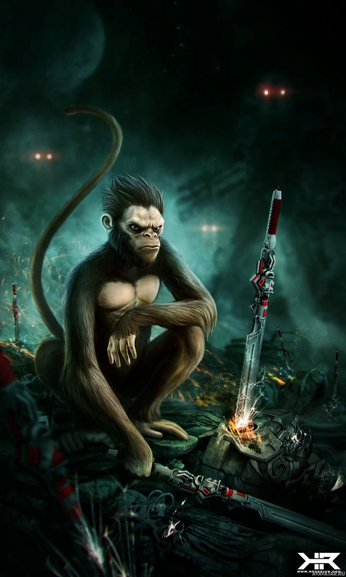 a science fiction setting. The monkey is holding a sword, suggesting it might be part of an adventure or storyline. In the background, there are futuristic elements such as blasters and