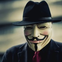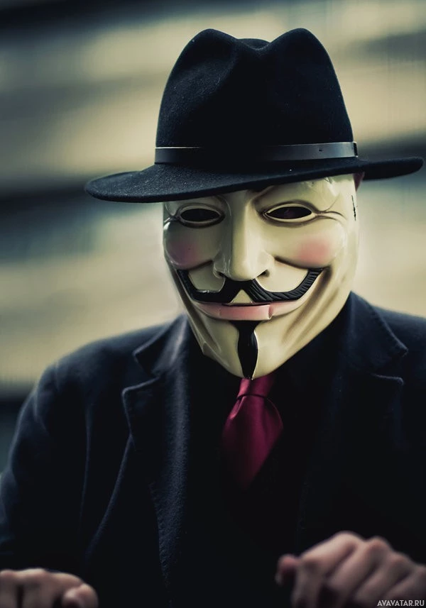 the iconic mask of Guy Fawkes, which is often associated with the Anonymous movement. This mask is characterized by the stylized profile of Guy Fawkes' face, with a mustache and goatee, set against