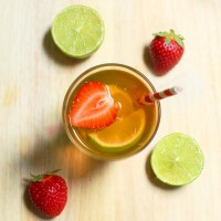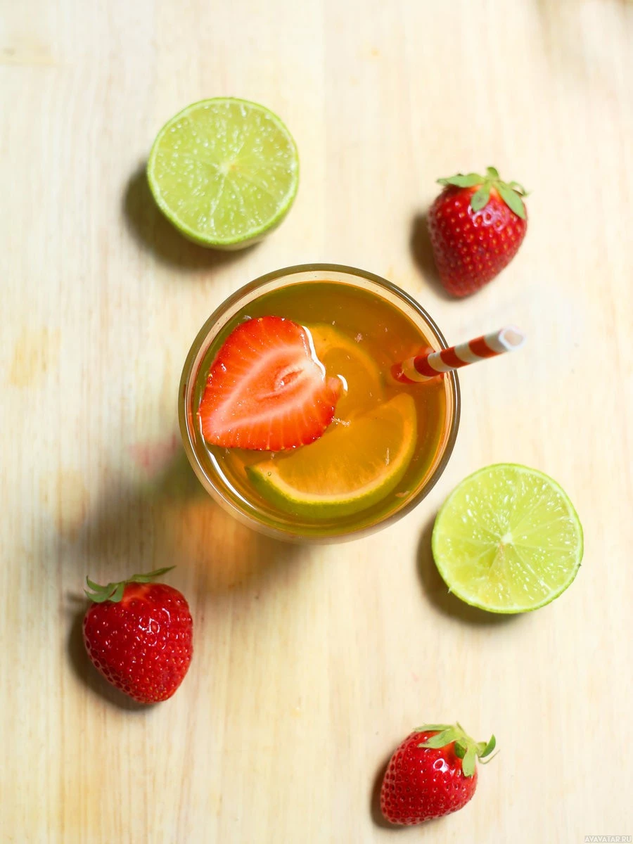 The picture shows a glass of strawberry juice with a few whole strawberries and sliced limes around it. There are also some slices of lime on the table next to the strawberry.