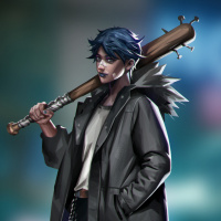 blue hair and is wearing a dark jacket over a white shirt. The character holds