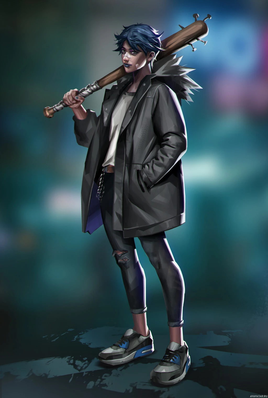 a baseball bat with both hands, suggesting she might be a player or fan of the sport. Her attire also includes leggings and sneakers, which gives her a sporty appearance. The background appears to be an alleyway at night, adding