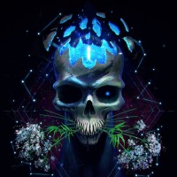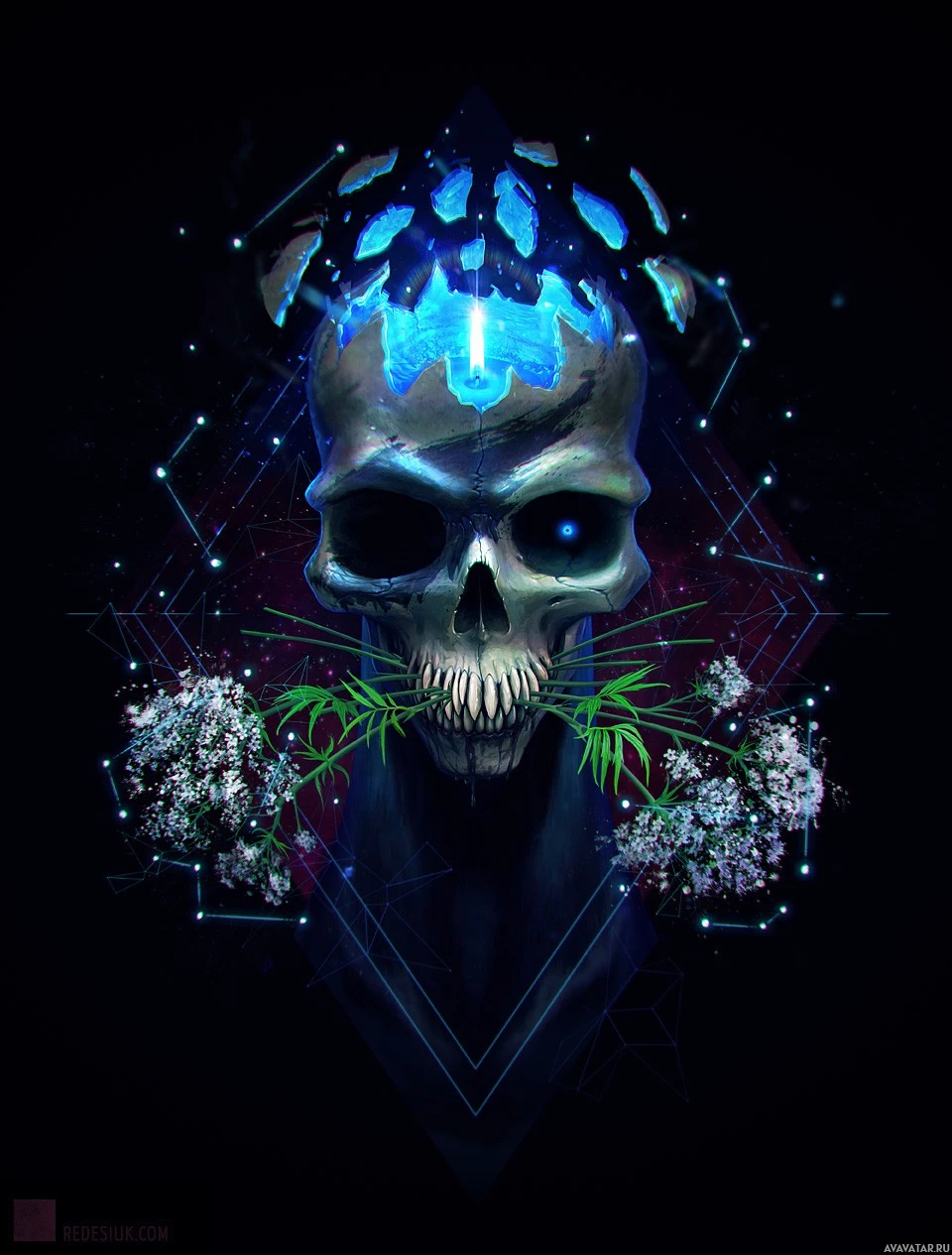 abstract shapes on either side of the skull's face. The image has an artistic and possibly symbolic quality, likely representing themes related to mortality, beauty, or the macabre.