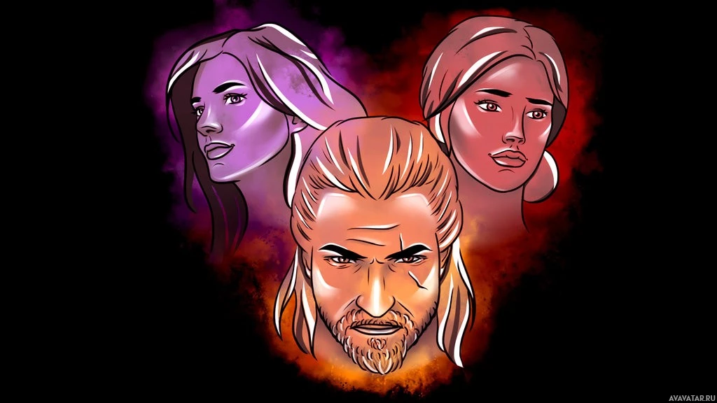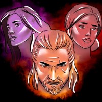 the realistic graphics of the game itself. The character on the right appears to be male, while Triss and Yennefer are